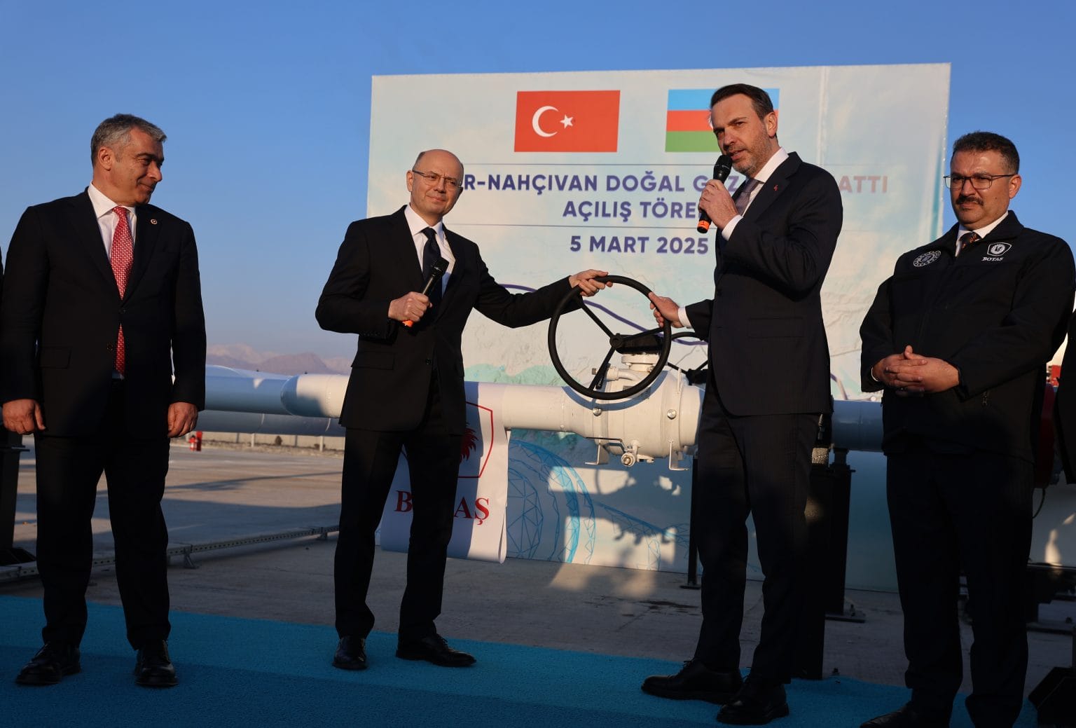 Bayraktar ve Şahbazov, boru hattının vanasını açarak ilk gaz akışını sağladı.